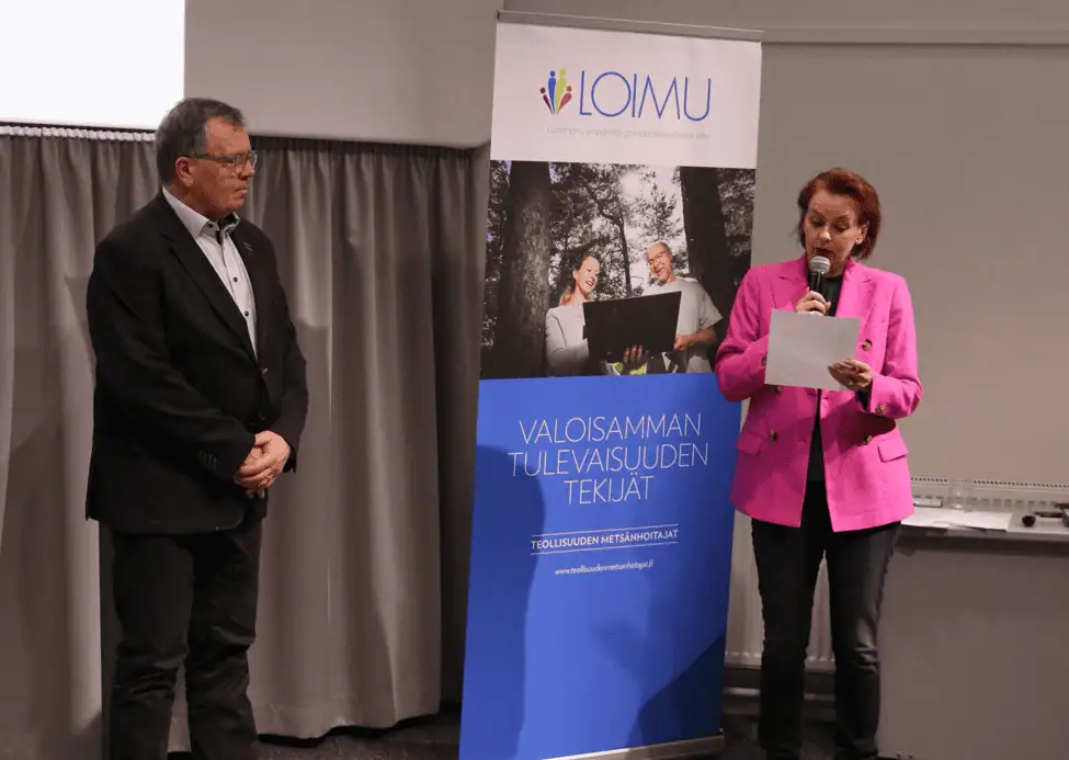 Metsäteho Oy palkittiin yhdistyksen ansiomitalilla. Heikki Pajuoja nouti ansiomitalin.